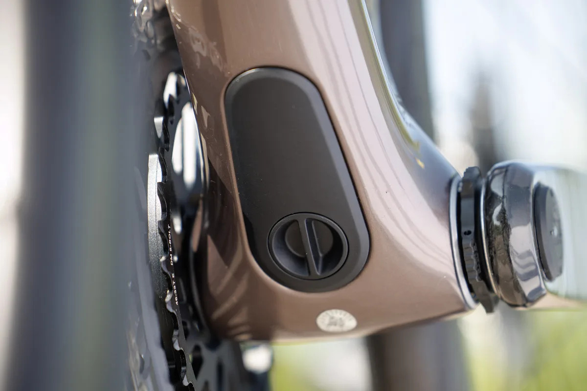 По словам Шово, дополнительный вес составляет всего 40г: дверца весит чуть меньше 10г, а на усиление рамы ушло только 25г углепластика. Если бы дверца была расположена под флягодержателями, как на других велосипедах, то ее пришлось бы делать гораздо массивнее и тяжелее. Механизм закрытия лючка такой же, как на горных Scott.