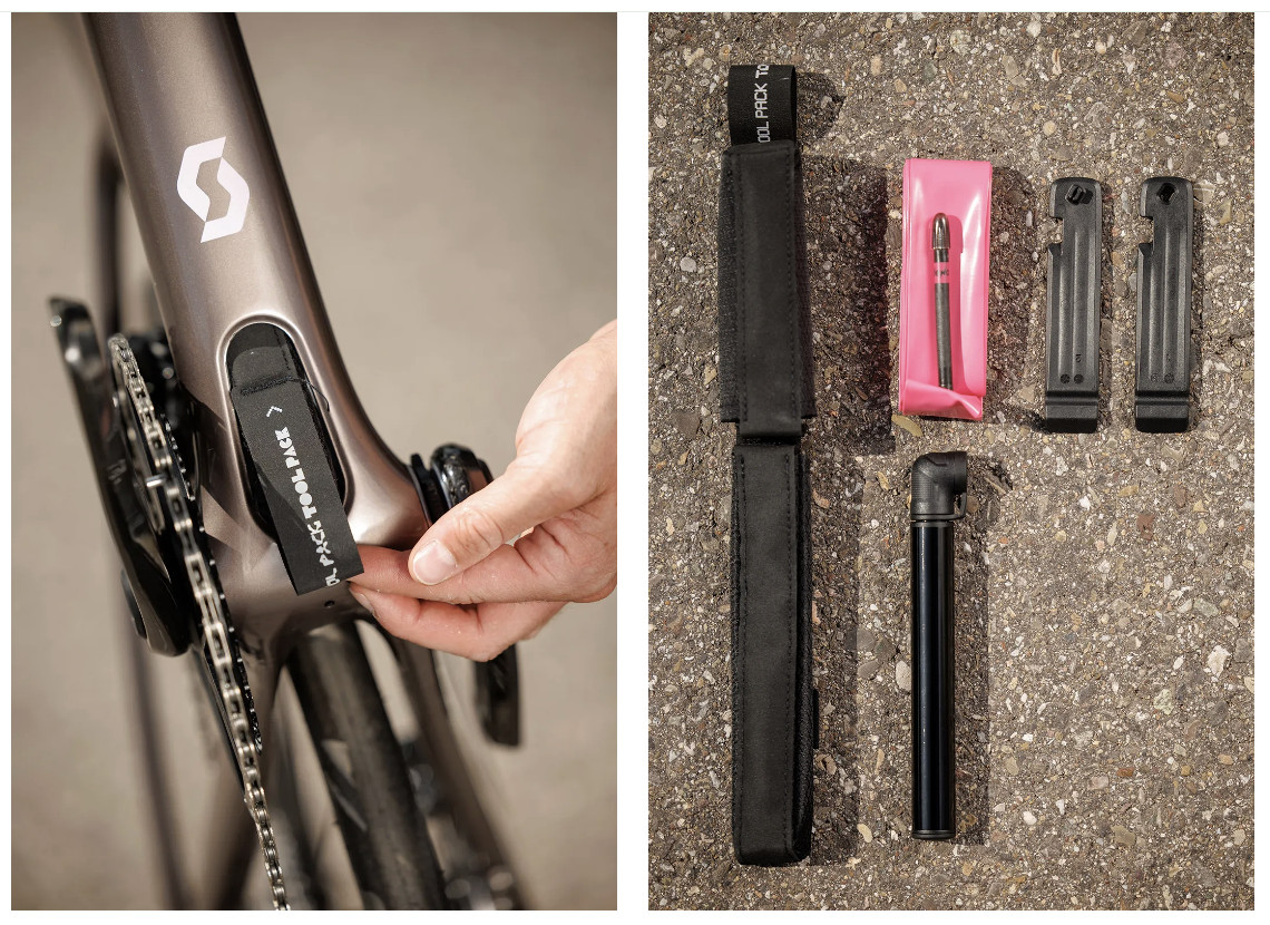 В нижней трубе встроен отсек для инструментов, доступ к которому открывается через лючок возле каретки. В нем помещен мини-набор для ремонта прокола: мини-насос, монтажки и камера (всё в чехле). Набор входит в комплектацию двух топовых моделей Addict и доступен как опция для остальных.
