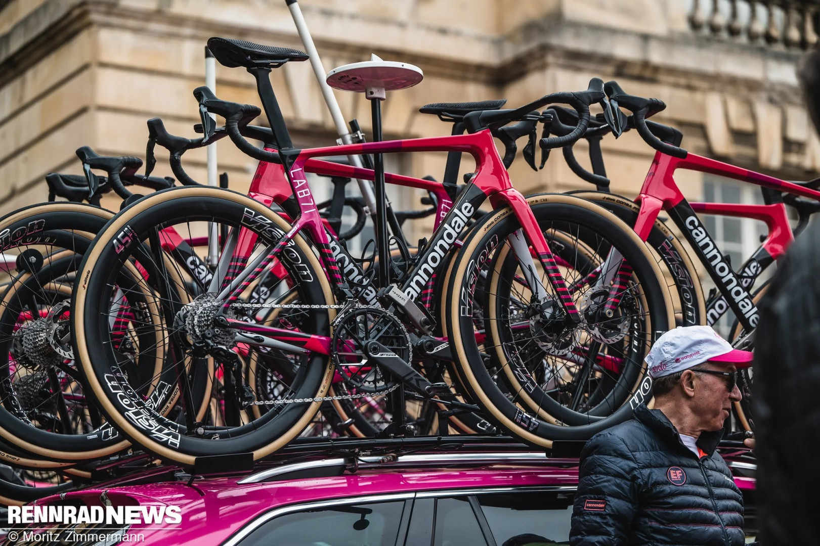 Велосипеды и гонщики EF Education EasyPost узнаваемы даже издалека. Cannondale SuperSix Evo Lab71 команды окрашен в ярко-розовый цвет и выглядит настоящим визуальным лакомством. Все велосипеды оснащены колёсами Vision 45 SL с шинами Vittoria Corsa Pro шириной 32 мм – очень популярный выбор в минувшие выходные.