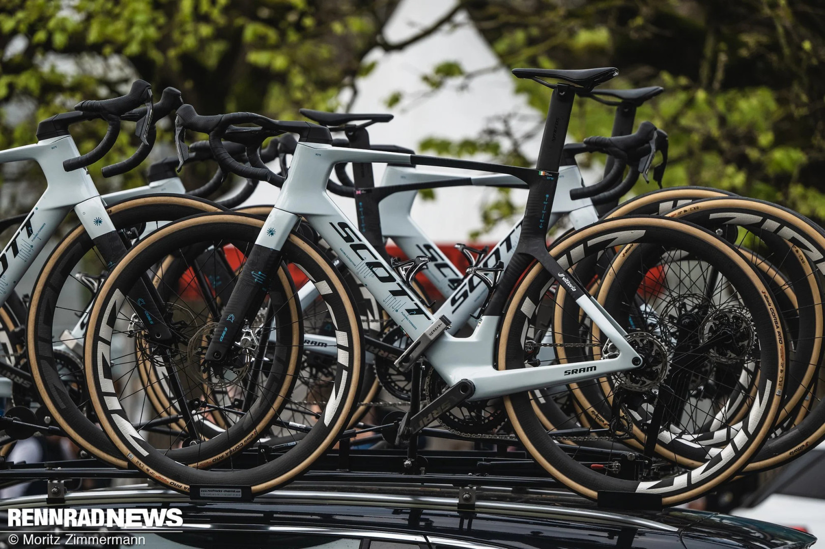 Команда Q36.5 стартовала не на недавно представленном Addict, а на аэрооптимизированном Scott Foil. Особый интерес вызывают колеса Zipp, которые, судя по всему, являются прототипами – на это указывают заклеенные логотипы. Карбоновые обода, похоже, оснащены новой версией системы мониторинга давления TyreWiz от SRAM, но подробности, естественно, не разглашались.