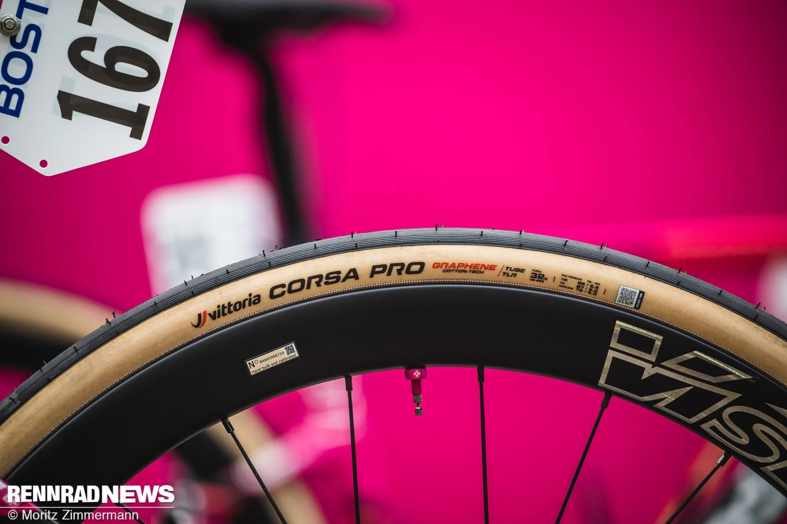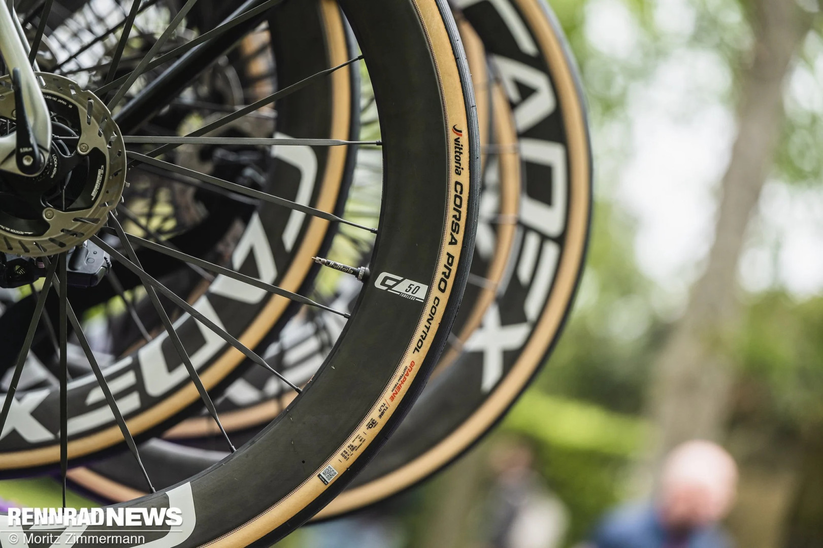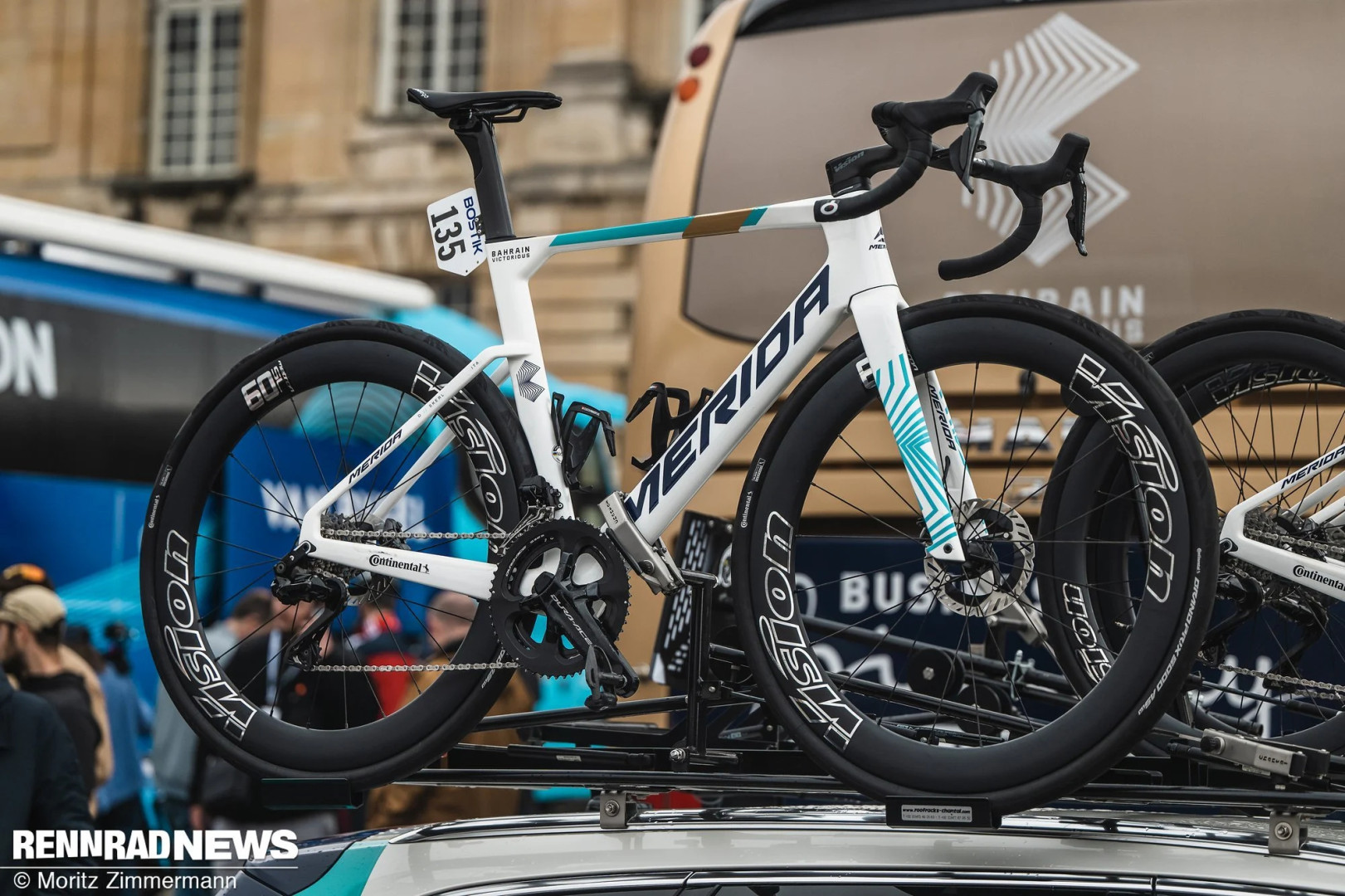 Merida Reacto команды Bahrain Victorious на Париж-Рубе 2025 была оснащена, в частности, 60-миллиметровыми ободами Vision. Это ясно указывает на аэродинамическую направленность. Колеса частично были укомплектованы шинами Conti GP5000 в версии AS (All Season), которые обеспечивают повышенную защиту от проколов, что, вероятно, положительно сказалось на комфорте.