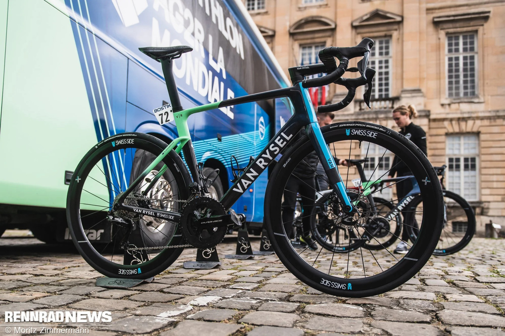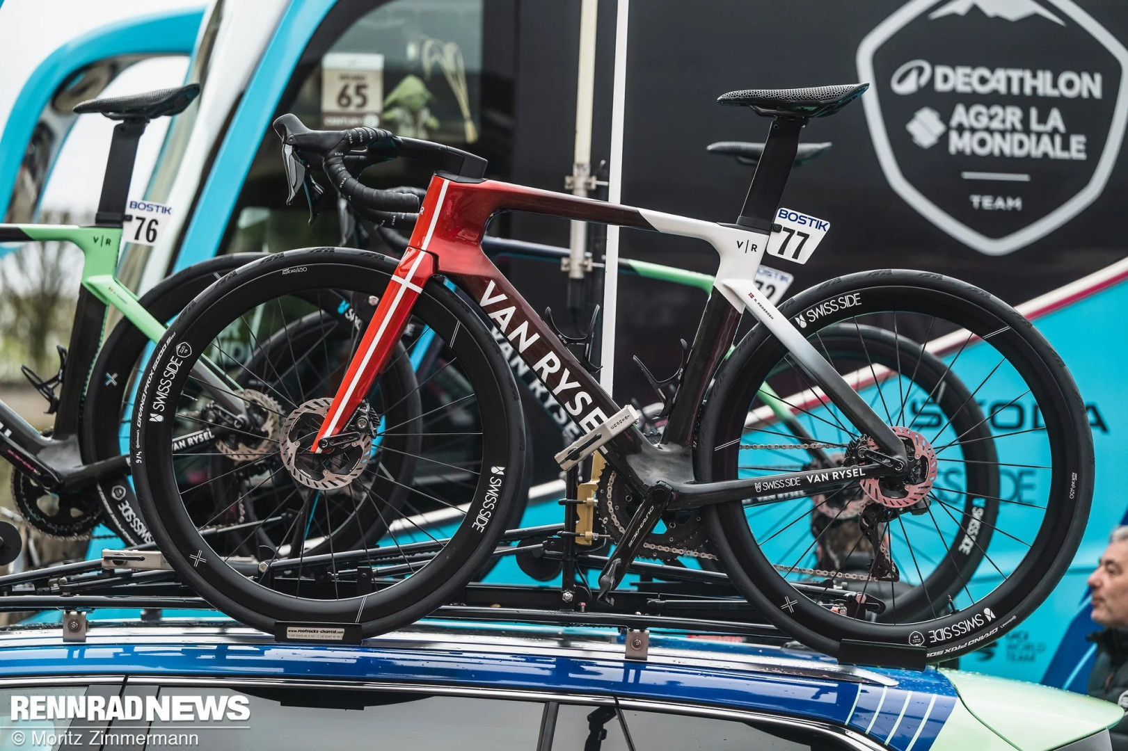 Недавно Van Rysel представили аэродинамический велосипед RCR-F, и большая часть команды Decathlon AG2R сразу перешла на эту новую модель – за исключением австралийца Оскара Чемберлена, который использовал RCR. Давление воздуха 3,2 бар в 32-миллиметровых шинах Continental GP 5000 S стало ключом к успеху. Кроме того, кокпиты у разных гонщиков значительно отличались друг от друга.