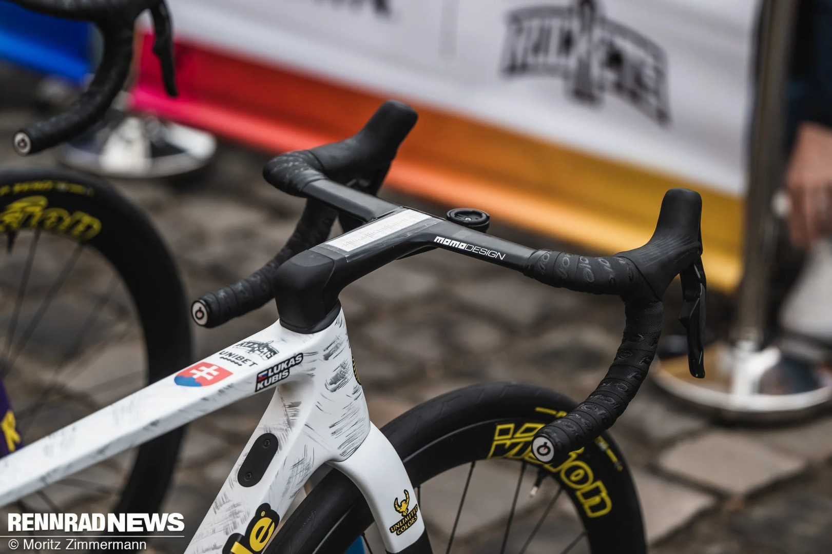Как и EF Education EasyPost, команда Unibet Tietema Rockets выступала на весьма заметных Cannondale SuperSix Evo. Велосипед Лукаша Кубиса, действующего чемпиона Словакии, выделялся особой раскраской, которая определенно радует глаз. Липкая лента на внутренней стороне держателя фляги обеспечивала надежную фиксацию фляги – такую модификацию можно было видеть и на других велосипедах.