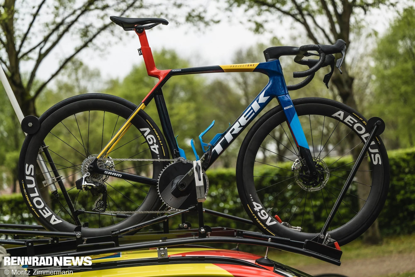 Trek Madone уже давно является основным велосипедом команды Lidl Trek. На предыдущих классиках некоторые гонщики, например Мадс Педерсен, использовали трансмиссии 1x. На Париж-Рубе американская команда в целом придерживалась этой концепции, но сочетала 13-скоростной задний переключатель SRAM Red XPLR с 12-скоростной кассетой. Для этого переключатель был модифицирован: в нем просверлили отверстие, чтобы установить удлиненный ограничительный винт, зафиксированный Loctite. Команда рассчитывала на более стабильную работу переключателя. Однако шансы Мадса Педерсена на победу, которые у него определенно были, рухнули из-за прокола шины в момент атаки Погачара.