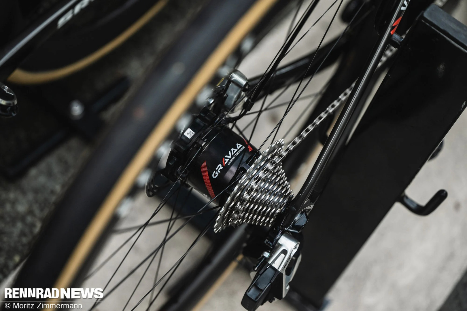 Команда Visma полностью использовала систему Gravaa. Это специальные втулки, соединенные с ободами, которые через контроллер на руле позволяют регулировать давление в шинах. Здесь показана задняя втулка, но вся технология, включая «мозги», находится во втулке переднего колеса. Точные значения давления не раскрыли.